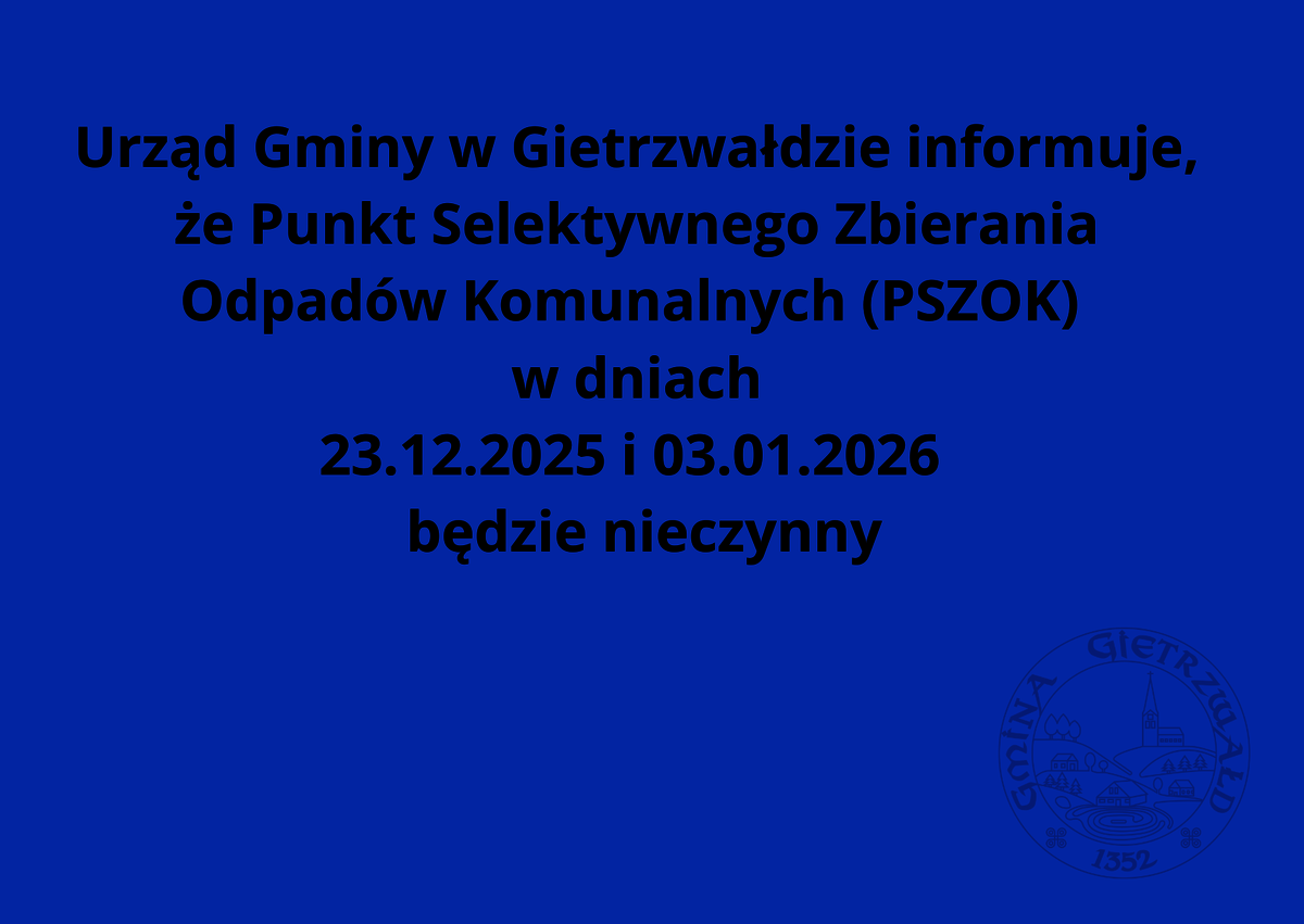 Informujemy, że Punkt Selektywnego Zbierania Odpadów Komunalnych (PSZOK) w dniach 23.12.2025 i 03.01.2026 będzie nieczynny.